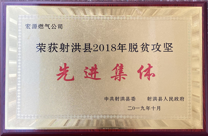 2019年10月15日,在射洪縣文化藝術(shù)中心召開(kāi)的“大愛(ài)扶貧 濟(jì)善射洪—2019年射洪縣脫貧攻堅(jiān)暨社會(huì)扶貧工作推進(jìn)會(huì)”上,宏源公司被中共射洪縣委、射洪縣人民政府表彰為“射洪縣2018年度脫貧攻堅(jiān)先進(jìn)集體”,公司團(tuán)委書(shū)記、大榆鎮(zhèn)飛石溝村駐村工作隊(duì)隊(duì)員劉軍被表彰為“射洪縣2018年度脫貧攻堅(jiān)先進(jìn)個(gè)人”。