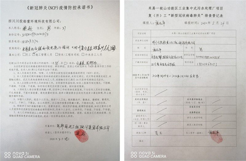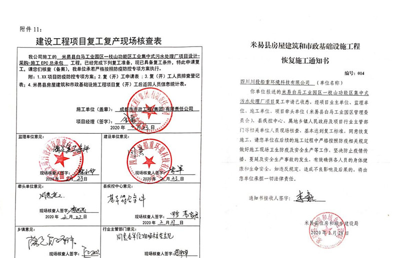 四川川投船重環(huán)境科技有限公司為堅(jiān)決打贏新冠肺炎NCP疫情防控阻擊戰(zhàn),早日實(shí)現(xiàn)項(xiàng)目復(fù)工,按照屬地管理要求,毫不松懈地抓好春節(jié)期間及節(jié)后公司、施工單位人員疫情防控工作,提前謀劃和部署公司及項(xiàng)目現(xiàn)場在NCP疫情期間的防控管理工作及施工組織方案、措施和應(yīng)急預(yù)案。做好防疫情,抓復(fù)工,盯安全,重施工,合理有序組織復(fù)工及防疫工作。經(jīng)米易縣政府組織有關(guān)部門對(duì)施工現(xiàn)場防疫措施及防疫物資準(zhǔn)備等工作的現(xiàn)場核查,達(dá)到復(fù)工標(biāo)準(zhǔn)。在2020年2月28日取得米易縣首批建筑施工項(xiàng)目復(fù)(開)工批準(zhǔn)令后復(fù)工(米易住建局編號(hào)014號(hào)《恢復(fù)施工通知書》),目前正按縣政府關(guān)于復(fù)工相關(guān)要求,全力組織施工單位人員持健康證明等手續(xù)陸續(xù)進(jìn)場。