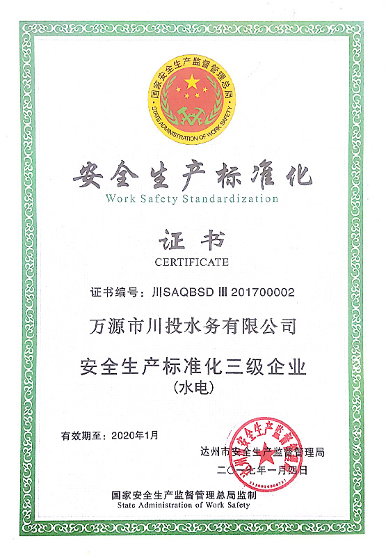 萬源水司安全標(biāo)準(zhǔn)化證書