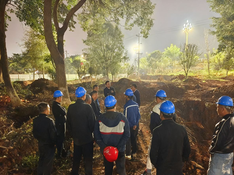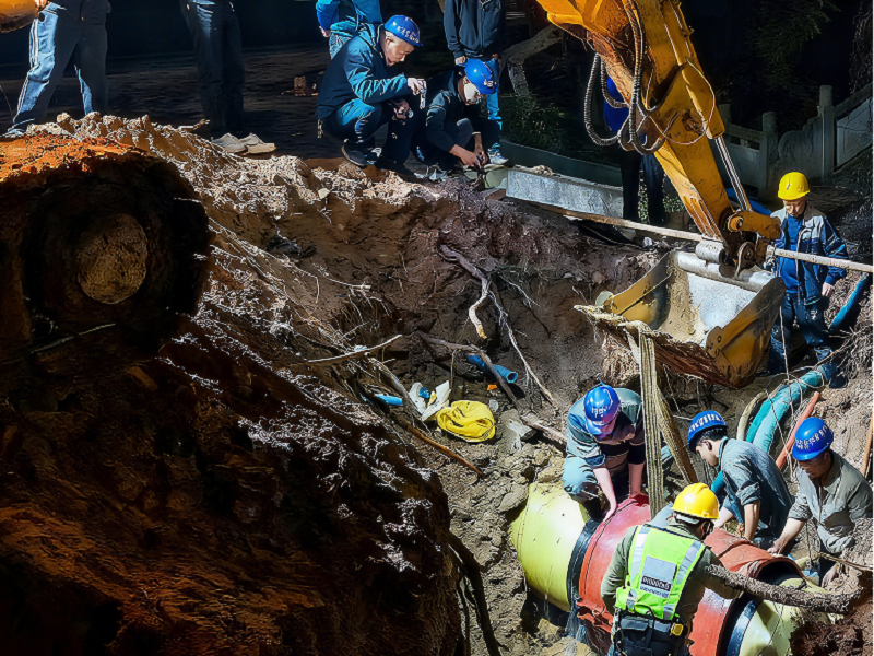 隨后,朱禹迅速按照預(yù)案,成立由其本人擔(dān)任組長、班子其他成員任副組長,工程技術(shù)部、綜合管理部、客戶服務(wù)中心、供水部等部門負(fù)責(zé)人及技術(shù)骨干為成員的搶險(xiǎn)指揮部,并下設(shè)兩個(gè)搶險(xiǎn)小組:第一組由公司常務(wù)副總經(jīng)理秦榮負(fù)責(zé),承擔(dān)中金快通興隆鎮(zhèn)凱歌大道中段供水主管的搶修任務(wù);第二組由公司副總經(jīng)理杜剛、高峰共同負(fù)責(zé),承擔(dān)繼光水廠DN700出水母管的搶修任務(wù)。指揮部確定了 “先控險(xiǎn)、再修復(fù)、保民生、兩線同時(shí)作戰(zhàn)”的搶險(xiǎn)總思路,并立下 “28日早上9時(shí)前恢復(fù)縣城區(qū)正常供水”的硬性目標(biāo)。各部門職責(zé)清晰細(xì)化:工程技術(shù)部主攻現(xiàn)場(chǎng)搶修,綜合管理部負(fù)責(zé)信息發(fā)布,客戶服務(wù)中心對(duì)接用戶溝通,供水部負(fù)責(zé)供水調(diào)度,全體人員隨即進(jìn)入“戰(zhàn)時(shí)狀態(tài)”,全時(shí)輪班投入搶險(xiǎn)工作中。