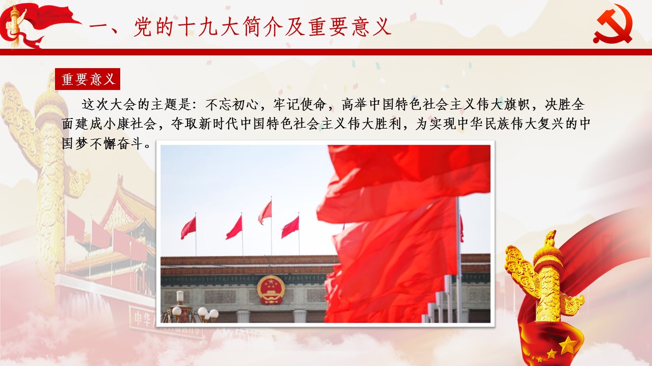 中國共產(chǎn)黨人的初心和使命,就是為中國人民謀幸福,為中華民族謀復(fù)興。中國共產(chǎn)黨第十九次全國代表大會(huì),是在全面建成小康社會(huì)決勝階段、中國特色社會(huì)主義進(jìn)入新時(shí)代的關(guān)鍵時(shí)期召開的一次十分重要的大會(huì)。大會(huì)的主題是:不忘初心,牢記使命,高舉中國特色社會(huì)主義偉大旗幟,決勝全面建成小康社會(huì),奪取新時(shí)代中國特色社會(huì)主義偉大勝利,為實(shí)現(xiàn)中華民族偉大復(fù)興的中國夢(mèng)不懈奮斗。習(xí)近平強(qiáng)調(diào),不忘初心,方得始終。中國共產(chǎn)黨...